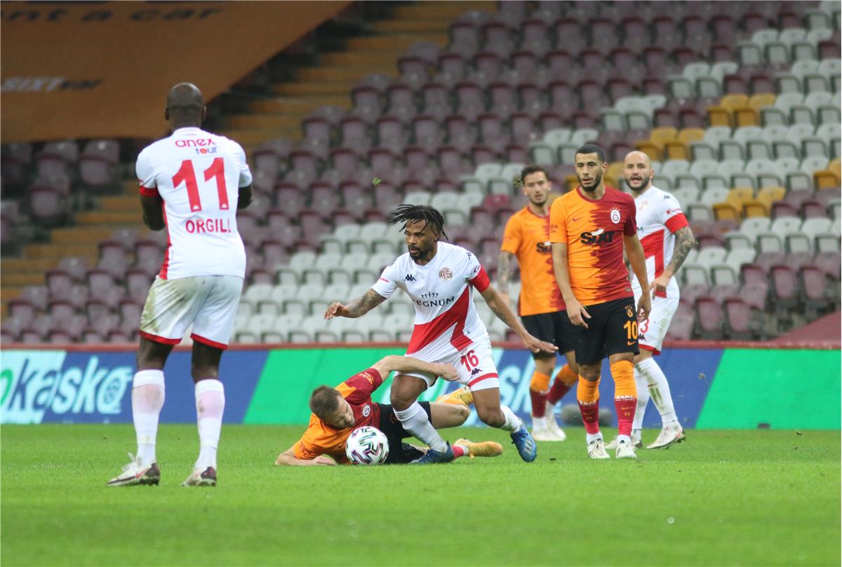 Süper Lig'de 16'ncı hafta karşılaşmasında Fraport TAV Antalyasporumuz, İstanbul'da Galatasaray'ın konuğu oldu. Karşılaşma takımımızın vuruşuyla başladı. İlk 10 dakikada Boffin iki güzel kurtarışla dengenin bozulmasına izin vermedi. Bu iki pozisyonun dışında her iki takım da gol şansı yakalayamayınca karşılaşmanın ilk yarısı golsüz eşitlikle sona erdi. Mücadelenin ikinci yarısına da takımımız aynı 11'le başladı. 49'uncu dakikada Belhanda'nın yerden sert şutu Boffin'de kaldı. 51'inci dakikada Amilton'u sert bir müdahale ile düşüren Emre Kılınç, kırmızı kartla oyun dışında kaldı. 75'inci dakikada Orgill'in ceza alanı dışından vurduğu top Okan'da kaldı. 77'de Oğulcan'ın şutunu ön direkte Boffin çıkardı. 80'inci dakikada Amilton'un yakaladığı kontra atakta Marcao son anda araya girdi. 90'ıncı dakikada Kerem'in kafa vuruşu Boffin'de kaldı. Karşılaşmanın 90 dakikası 0-0 beraberlikle sona erdi.