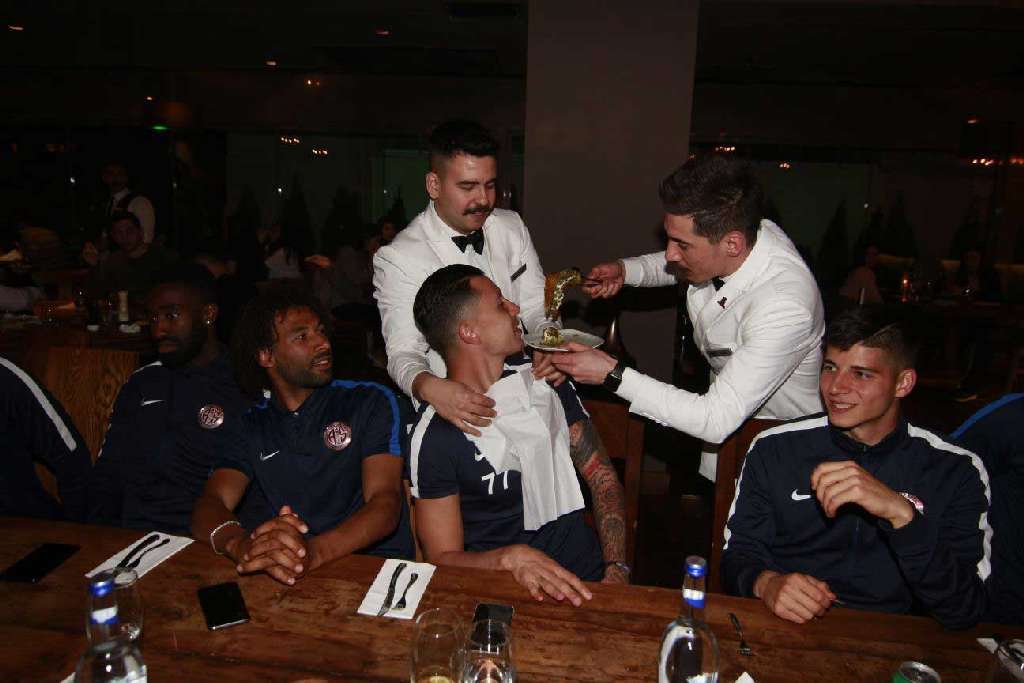 Aynı gün 29 yaşına giren futbolcumuz Emre Güral'ın doğum günü kutlaması da restoranda yapıldı. Emre Güral için yaş pasta yerine dondurmalı baklava hazırlandı. Emre Güral takım arkadaşlarının alkışları eşliğinde baklava üzerindeki alevi söndürdü.